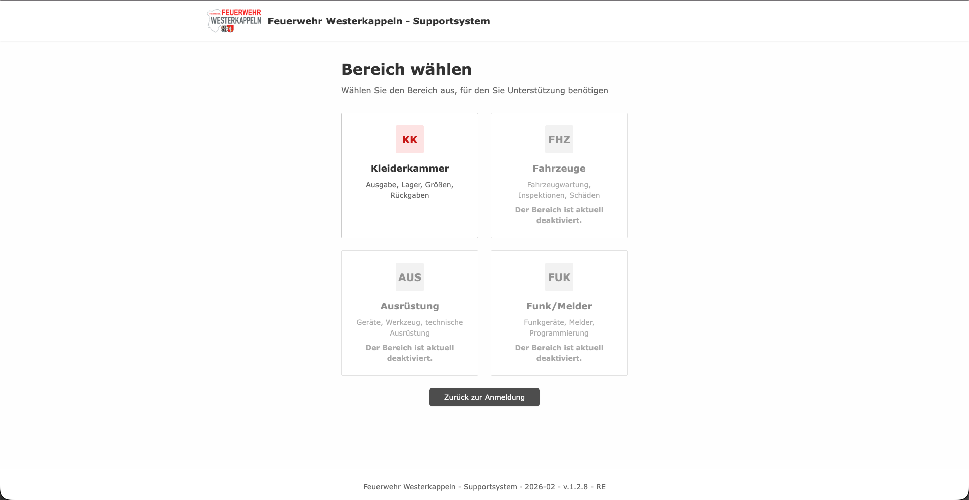 Hier siehst du verschiedene Kacheln oder Kategorien (z. B. IT & Funk, Fahrzeugtechnik, Kleiderkammer). Wähle den Bereich aus, in dem du Unterstützung brauchst oder den zuständigen Ansprechpartner erreichen möchtest.